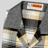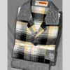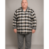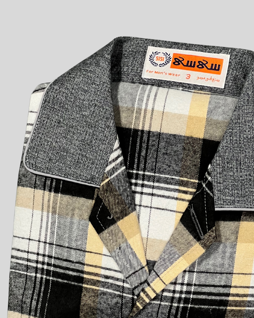 تصميم القميص يأتي بنقشة كاروهات أنيقة تجمع بين الأسود والرمادي والبيج، بينما يأتي البنطال بلون رمادي جكار يمنح توازناً رائعاً مع القميص.