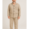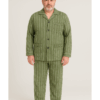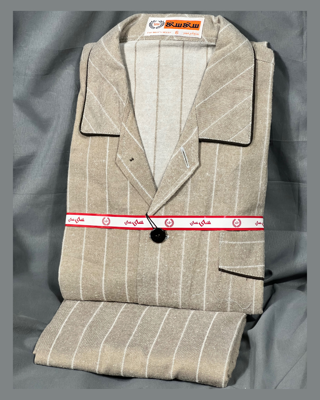 بجامة شتوية رجالية من قماش البازة القطني المصري الفاخر، ناعمة ودافئة بملمس مريح يناسب الليالي الباردة. تصميم كلاسيكي مخطط، 4 أزرار، 3 جيوب عملية، وبنطال بنفس النقشة. خامة قوية تدوم طويلاً وراحة ممتازة طوال الليل.